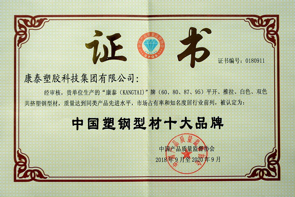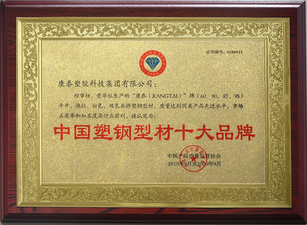 康泰型材(cái)被評為“中國塑(sù)鋼型(xíng)材十大品牌”