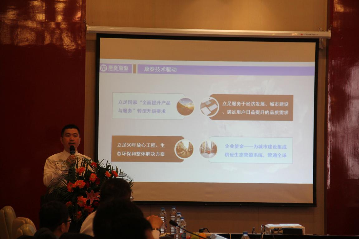 接著,康泰集團技術總監張雙全向在場嘉賓介紹了康泰集團的新產品體係,重點介紹了康泰MPP單壁波紋管道係統、環保雨、汙水用MPVE®雙(shuāng)壁波紋管道係統等產品。參會嘉賓認真聽取了公司的產品介紹,對康泰新產品的物理性能、產品質量和化學配方等方麵給予了高度評價。