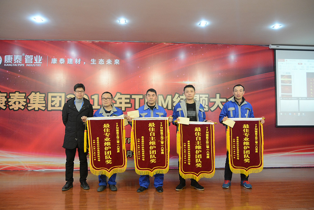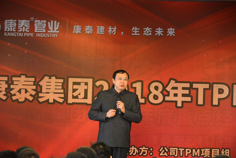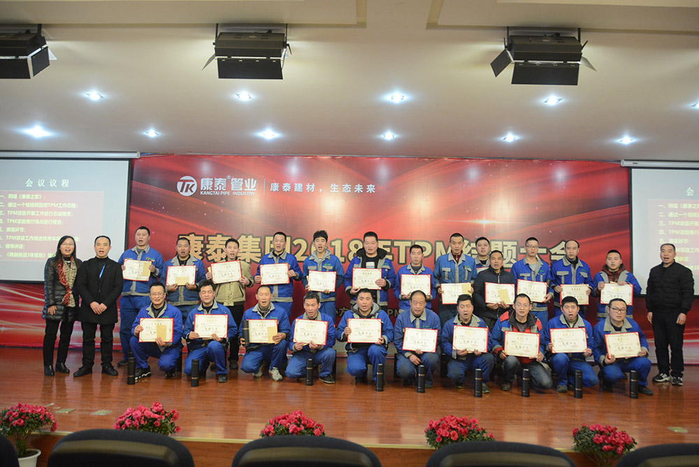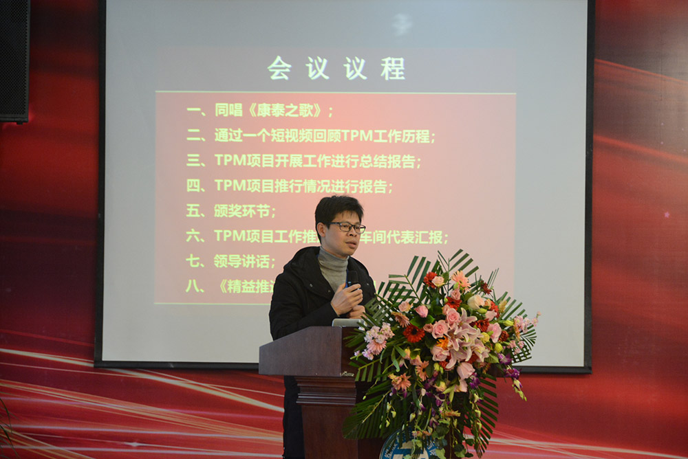 會議(yì)首先通過視頻回顧了TPM項目的導入、實(shí)施(shī)、改(gǎi)善,並對成果進行了展(zhǎn)示。隨後,TPM項目組組長、生產副(fù)總監(jiān)李誌堅作了《TPM項目開展工作進行總結匯報》。為了提升康泰集團在塑膠行業的競爭力,滿足客(kè)戶(hù)日益多樣化的需求,2017年9月28日,康泰集團導(dǎo)入了TPM——全麵生產(chǎn)管理體係,圍繞TPM的自主維護、專業維護、現場改善(shàn)及可視化等開展活動。通過活動的開展,生產係統各級對於TPM有了深刻(kè)的認識,車間員工學到了知識,提升了技能,對設備的傳統觀念有了轉變。截(jié)止2019年1月,現場發現問題7035項,整改6590項,整改率98% 。建立集團設(shè)備預防性維修保養體係,形(xíng)成階段(duàn)性標準化文件8份,設備故障率(lǜ)下降30% 。
