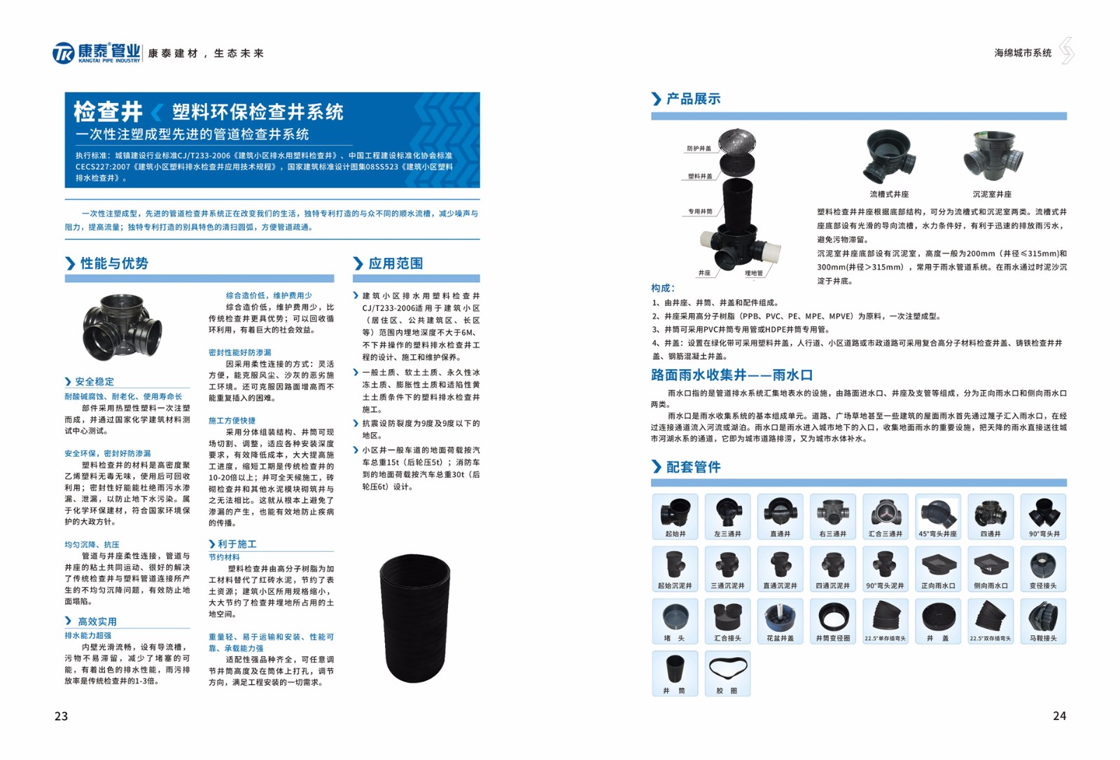 康泰海綿城市係統用主要產(chǎn)品有普通(tōng)型、加強型、抗紫外光型、抗老化(huà)型、抗震型、抗腐蝕型、防結垢型多功能MPP雨水集成模塊,高(gāo)強度 PVC,抗震性PE,開槽式、打孔式滲排管,一(yī)次性注塑成(chéng)行塑料檢查井及配件;排水管有MPVE雙壁波紋管、PE鋼帶增強纏繞管、PE雙壁波紋管、PVC雙壁波紋管,PVC實壁管、PE實壁(bì)管、PVC-M實壁管,產品(pǐn)規格從110mm-2000mm,產品(pǐn)品類達到200多種,同時具備快速開發新產品的(de)資質與能力,滿足不同環境條件的需(xū)要(yào)。