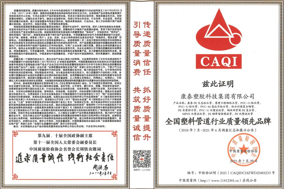 近日,康泰榮獲由中國質量檢驗協會頒發的“全國塑料(liào)管道行業質量領先品牌”、“全國塑料管道行(háng)業質量領先企業”、“全國質量(liàng)檢驗穩定合格產(chǎn)品”稱號。