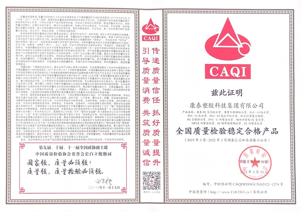 塑料管道行業是一個(gè)特殊的行業,質量(liàng)是這個(gè)行業(yè)的生命線。產品的好(hǎo)壞關係到萬千家庭的健康與安全。憑著對(duì)初心的執著(zhe)堅守,康泰率先通過了ISO9001國際質量(liàng)管理(lǐ)體(tǐ)係(xì)認證,更是(shì)成為參與塑料管道行業標準、國家標準編寫和製定的骨幹(gàn)企業。