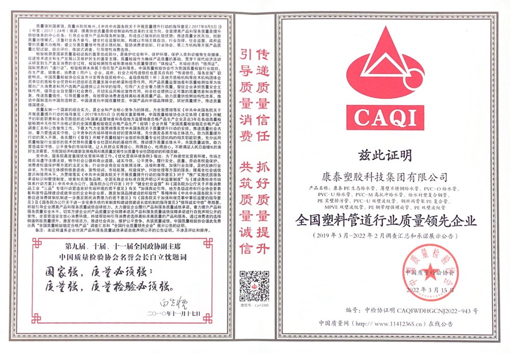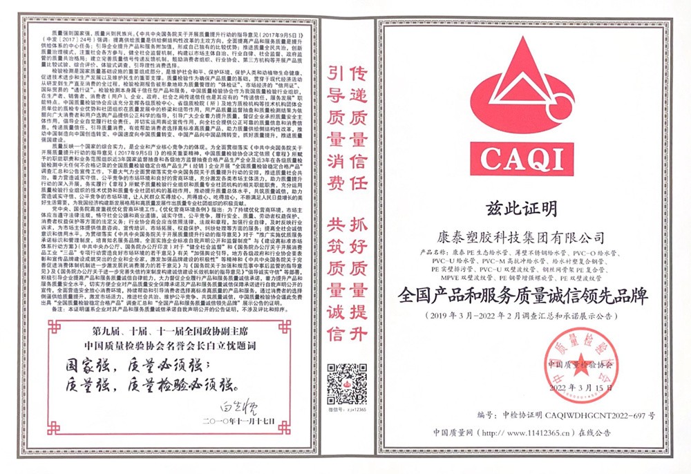 近日,憑借優質的產品、完善的服務、良好的(de)口碑,康泰集團一舉榮獲中(zhōng)國質量檢驗協會“全國塑料管道行業質量領先企業”、“全國產品和服務質量(liàng)誠信(xìn)領先品牌”兩項榮(róng)譽。