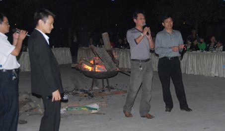 晚宴後,大家紛紛來到戶外,圍著篝火舉杯歡(huān)唱,在主持人幽默詼諧的帶領下,參與互動的員工熱情高昂。活動一直持續到晚上10點,大家仍然意猶未盡。