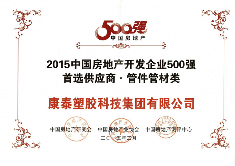 日前,“2015中國房地產500強測(cè)評成果發布會暨500強峰會”在北(běi)京國貿隆重舉行。值得恭賀的是,康泰集團首次入圍(wéi)“地產500強首選供應商 管件管材類”榜單,獲得了由中國(guó)房地(dì)產研(yán)究會(huì)、中國房地產業協會和(hé)中國(guó)房地產測評中心聯合頒發的“2015中國房地(dì)產開發企業500強首選供(gòng)應商品牌”榮譽證書。