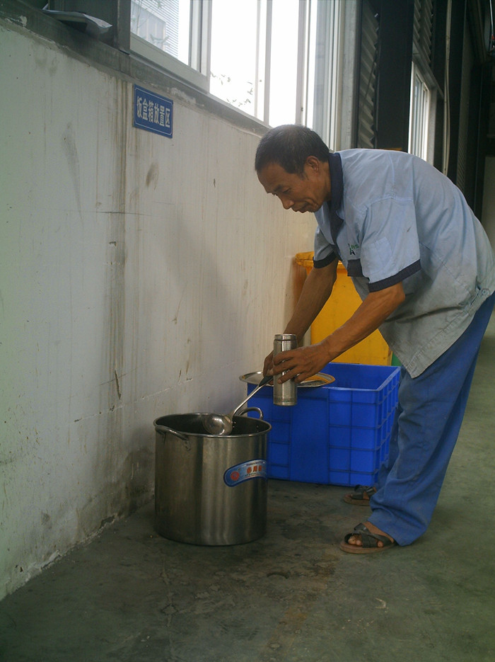 鄧師傅為(wéi)工友舀綠豆(dòu)湯(tāng)