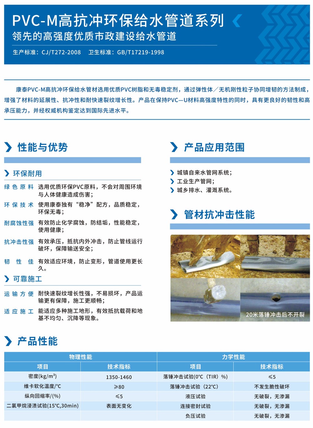 康泰塑膠科技(jì)集團(tuán)有限公司生產的PVC-M高(gāo)抗衝環保(bǎo)給水管材是在優(yōu)選PVC樹(shù)脂(zhī)、無毒穩定(dìng)劑的基(jī)礎(chǔ)上,通過(guò)彈(dàn)性體/無機剛性粒子協同增韌的方法製成的,采用該工(gōng)藝(yì)生(shēng)產的PVC-M高抗衝環保給水管材在保持PVC-U材料高強(qiáng)度特性的同時,具(jù)有更良好的韌性和高承壓能力,增強了材料的延展性、抗衝性、耐(nài)快速裂紋增長性(xìng)。產品經國家塑料製品質量監督檢測中(zhōng)心、四川省、河南省衛生檢測中心等權威機構檢測,其衛生性能、物理性能和(hé)力學性能完全符合(hé)相關國家標準和(hé)企(qǐ)業(yè)標準,經專家委員會(huì)鑒定達到國際先進水平。