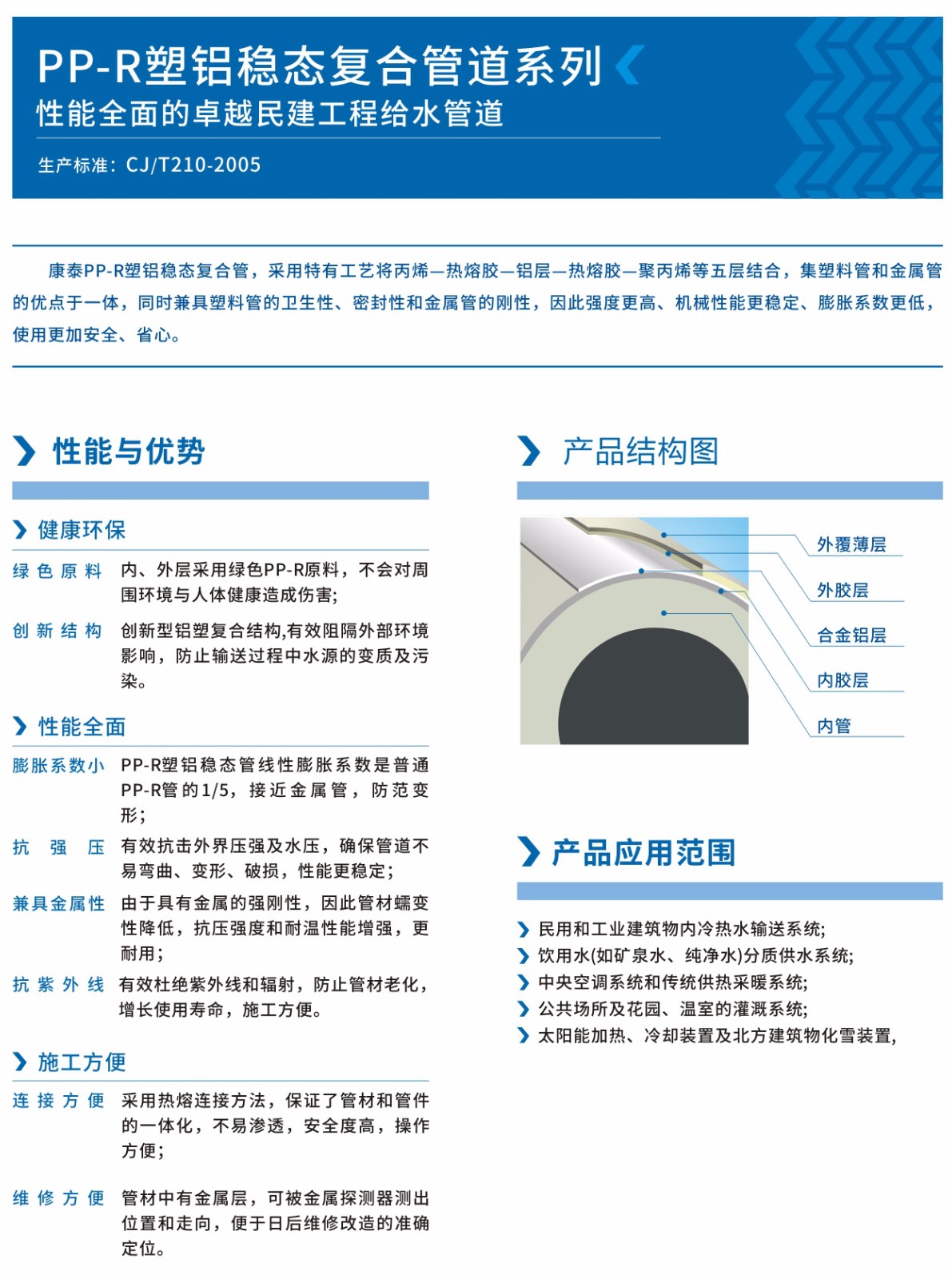 PP-R塑鋁(lǚ)穩態複合管是一種五層結構的複合管材,是將PP-R管與(yǔ)鋁層在高溫下通過特製熱熔膠有機結合(hé),形成了聚丙烯—熱(rè)熔(róng)膠(jiāo)—鋁層—熱熔膠—聚丙烯的特殊複合結構,內外層(céng)的PP-R材料(liào)可(kě)以保證(zhèng)管材在給水應用中的衛生性能,其中(zhōng)內層PP-R尺寸接近於普通PP-R管,是主要的承壓體,而中間的鋁層起加強保護作用。它集塑料管和金屬管的優點於一體(tǐ),同(tóng)時兼具(jù)塑料管的衛生性、密封性和金屬管的剛(gāng)性,具有更高的(de)強度和更穩定的機械性能,其線性膨脹係數是普通(tōng)PP-R管的1/5,接近於金屬管,具有更高的穩定性和安全性。