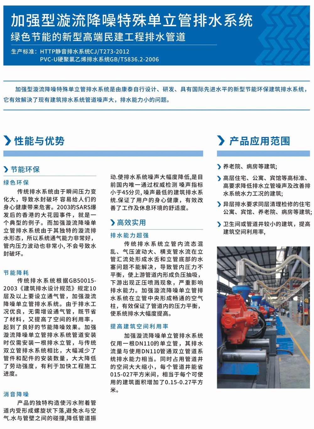 加強型漩(xuán)流降噪特殊單立管排水係統是由康泰(tài)自(zì)行設計、研發、具有國際(jì)先進水平的新型節能環保建築排水係統。它有效解決了現有建築排水係統(tǒng)管道噪聲大,排水能(néng)力小(xiǎo)的問(wèn)題。